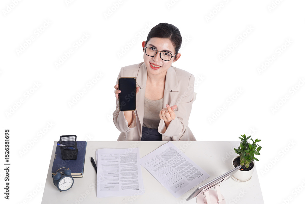 Asian businesswoman posing next to desk full of documents