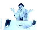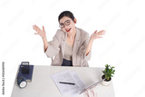 Asian businesswoman posing next to desk full of documents
