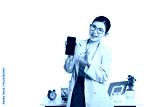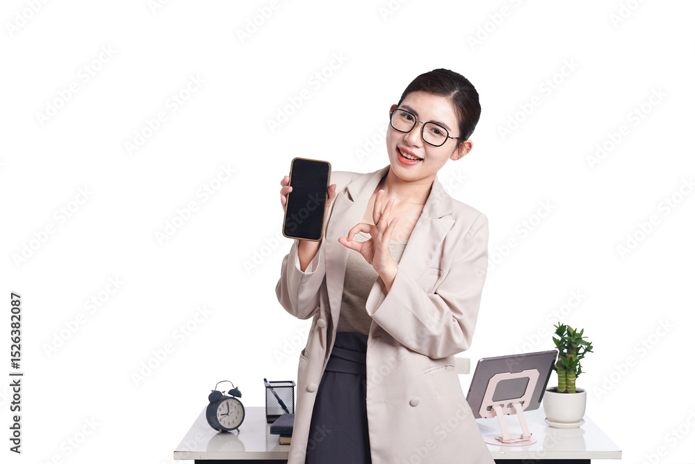 Asian businesswoman posing with smartphone, behind her is a table with lots of documents