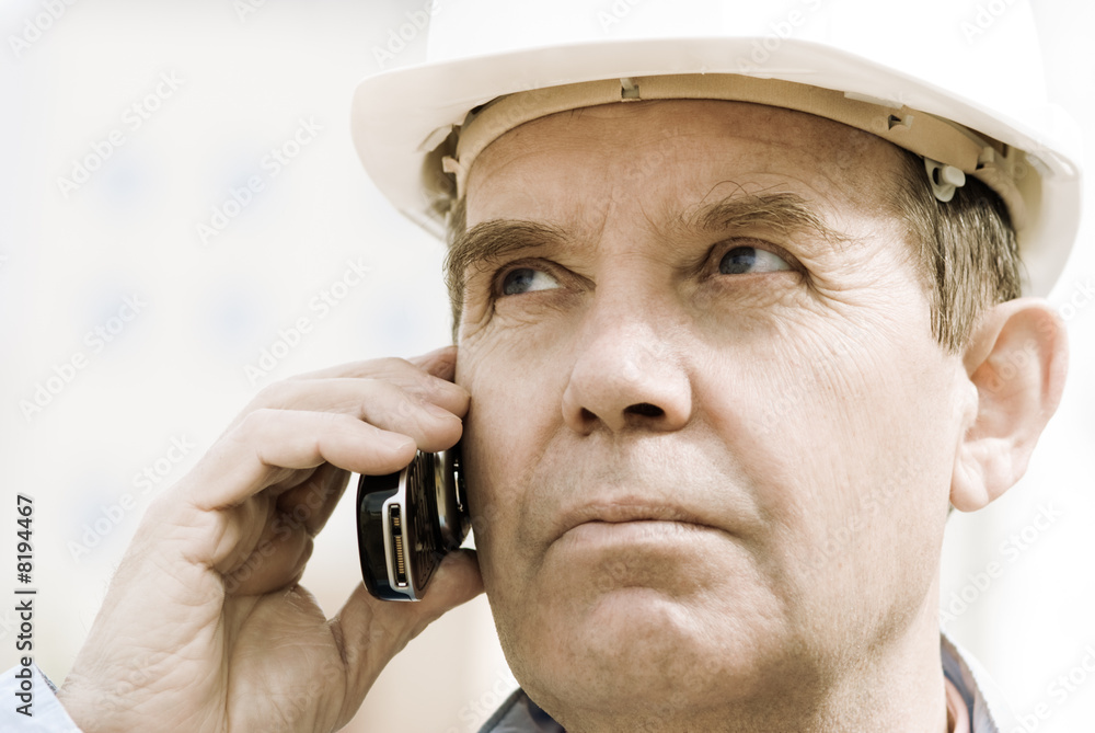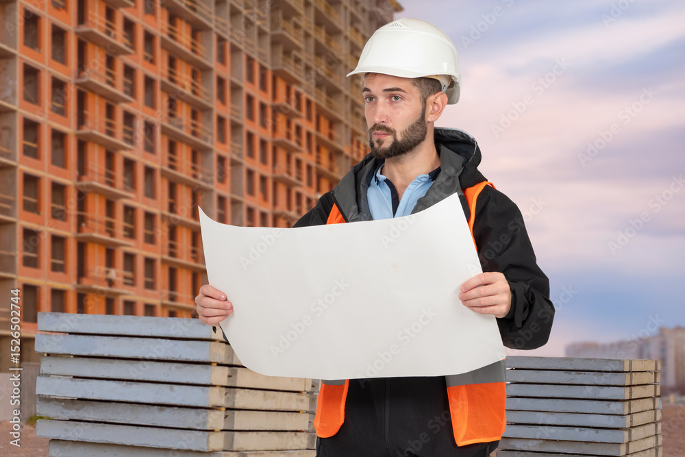 Construction engineer in safety vest and helmet reviews blueprint on site with a multi-story building under construction in the background. – Construction. Engineering.
