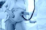 Gynecologist examining heartbeat in the abdomen of pregnant young woman sitting on couch in medical clinic. Obstetrician doctor or nurse checking her patient expecting a baby. Pregnancy concept.