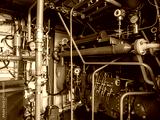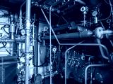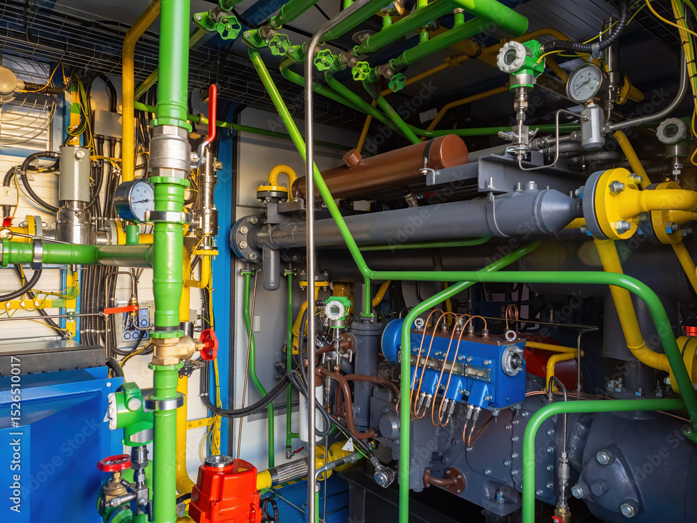 Complex industrial piping system with pressure gauges, valves, compressors, and control units for fluid or gas processing – Engineering, Industrial Equipment.