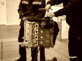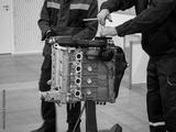 The engine is mounted on a stand, and the individuals are using hand tools while wearing industrial uniforms – Mechanical Maintenance, Engine Repair.