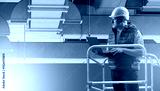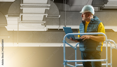 Technician with helmet and laptop inspects ceiling ventilation system from lift platform in modern industrial building. - Ventilation Installation.