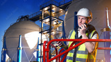 Man engineer of industrial plant. Factory employee uses walkie-talkie. Man engineer of BPVC enterprise. Oil and gas plant contractor. Industrial engineer near evening manufactory.
