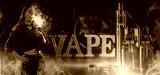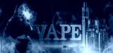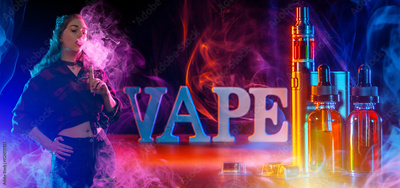 Vape logo behind woman. Girl near vaper set. Young woman exhales smoke from vape. Vaping hobby. Vape devices lady in neon light. Female beautiful vaper. Electronic cigarettes and oils