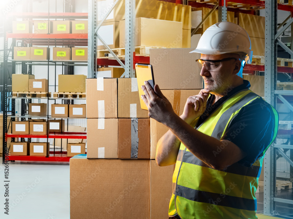 Man warehouse manager. Storekeeper with e-tablet. Warehouse manager scratching chin. Frowning supervisor doing inventory in warehouse. Man standing in factory storage area. Storekeeper in uniform