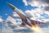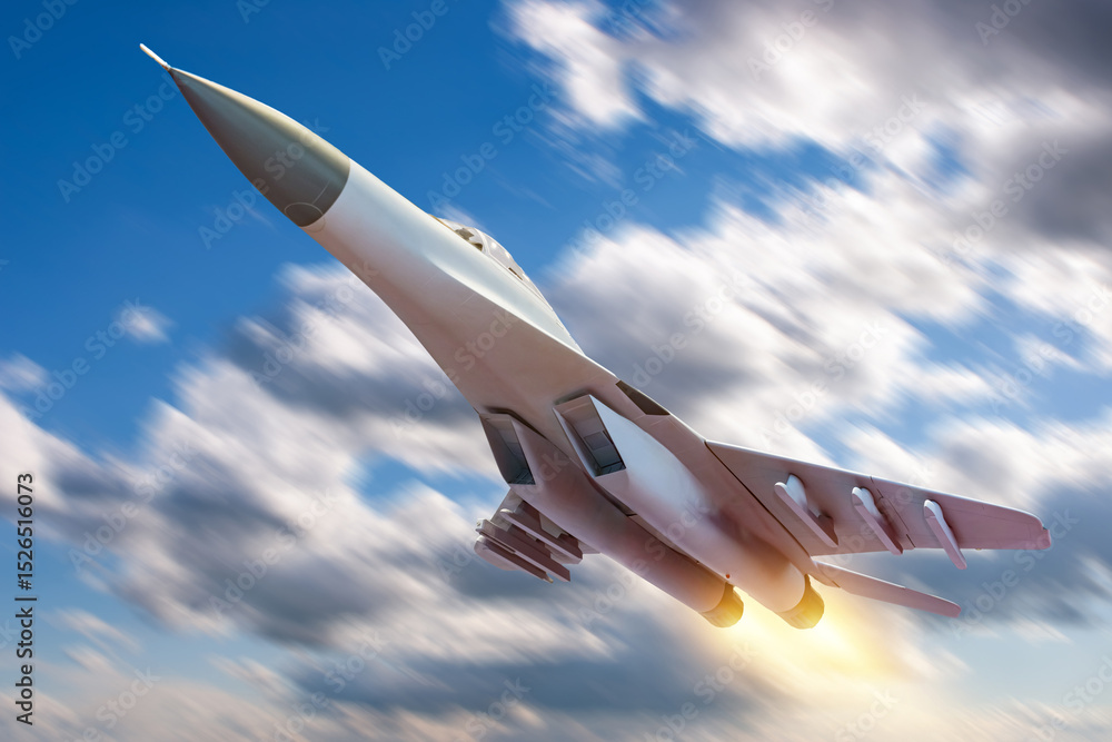 Jet plane in sky. Military plane among clouds. Fighter with missiles under its wings. Military plane takes off. Fighter jet of armed forces. Airplane flies during military mission. 3d image