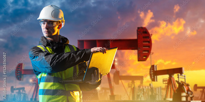 Man oil worker. Oil field designer. Petroleum corporation contractor. Portrait of man oil worker at sunset. Engineer with laptop works in petroleum industry. Hydrocarbon field development
