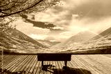 Autumn nature. Beautiful landscape. Bench with mountain view. Wooden terrace in picturesque place. Autumn landscape on warm day. Place for admiring nature. Serene autumn nature. Mountain landscape