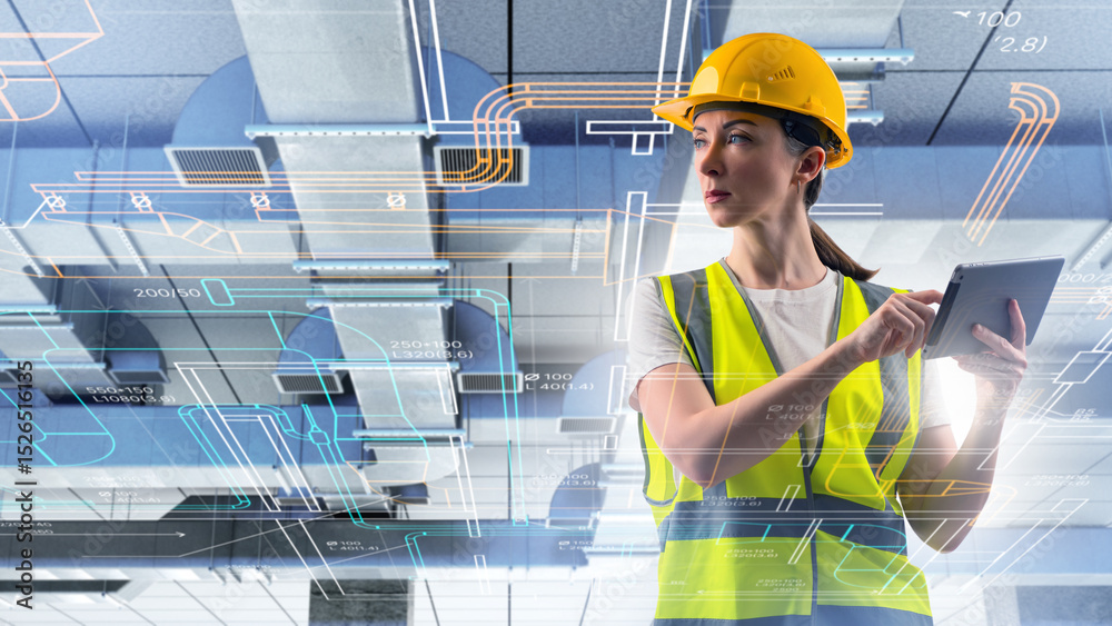 Design air shafts in building. Woman engineer. Architect under ventilation pipes. Air shafts for air filtration. Woman ventilation engineer in yellow uniform. Vents ducts. Ventilation infrastructure