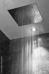 Modern ceiling rain shower with water flowing in a stylish tiled bathroom, illuminated by recessed lighting for a luxury wellness experience. – Interior Design. Plumbing. Wellness.