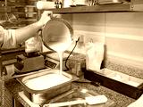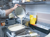 Chef pouring cream mixture from pot into metal container on kitchen counter with blender, scale, and ingredients for dessert prep. – Catering. Restaurant. Food Industry.