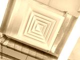 Close-up view of a square ceiling air vent with metallic ductwork and fluorescent lighting in an industrial ventilation system. – HVAC. Industrial Design. Construction.