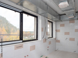 Interior of a tiled room under renovation with installed ventilation ducts and window frames, prepared for further construction work – Construction, Interior Renovation.