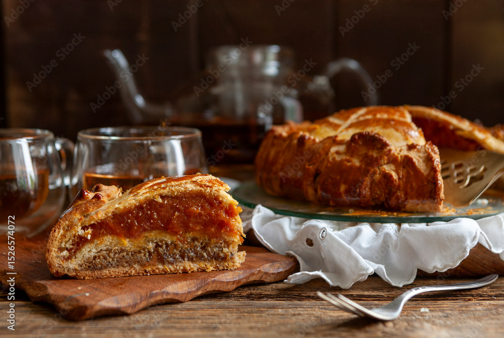 Traditional homemade Dagestani Botlikh pie with apricots and chopped walnuts