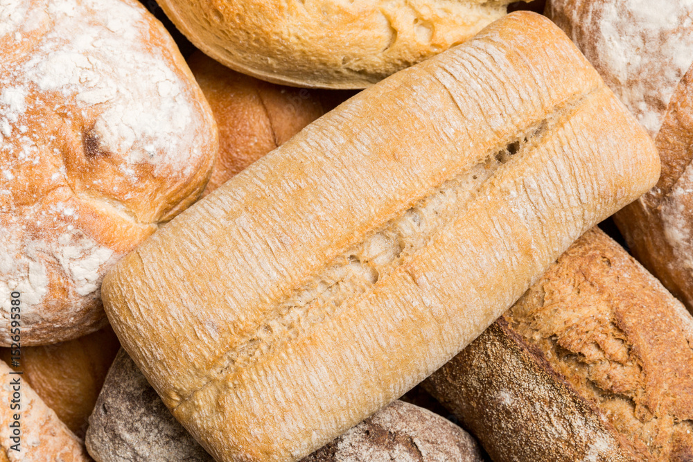 Homemade natural breads. Different kinds of fresh bread as background, top view with copy space