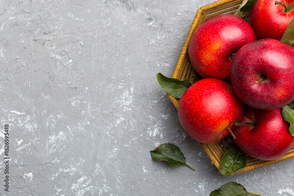 Many red apples on colored background, top view. Autumn pattern with fresh apple above view with copy space for design or text