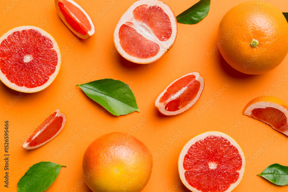 fresh Fruit grapefruit with Juicy grapefruit slices on colored background. Top view. Copy Space. creative summer concept. Half of citrus in minimal flat lay with copy space