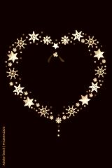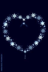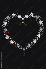 Christmas heart shape wreath decoration, white snowflakes, stars, mistletoe, red holly berries. Ornate festive design romantic symbol of love Xmas theme.