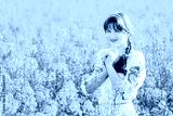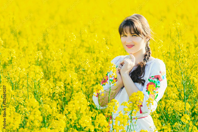 Beautiful young woman in Ukrainian embroidered standing in a field of yellow rape flowers