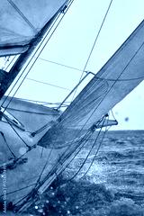 Sailing regatta in the Gulf of Finland at sunset, sailing yacht competing in a race, splashing water from under the boat, teamwork, board the boat