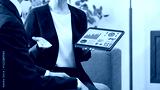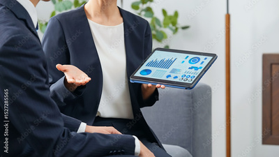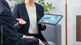 ロビーでタブレットを見ながら商談する男女ビジネスパーソンのグループ