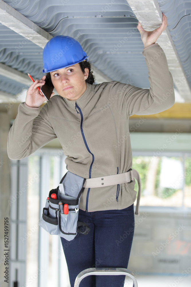 female construction worker talking on the phone
