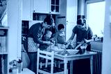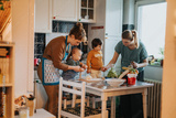 A group of people gathered around a kitchen preparing food together, emphasizing connection and collaboration in a warm and friendly setting.
