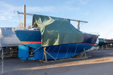 Sailboat covered and stored out of the water for the winter, winter storage for the sailboat in Finland, Suomenoja, winterizing , short season in Northern country, cold conditions