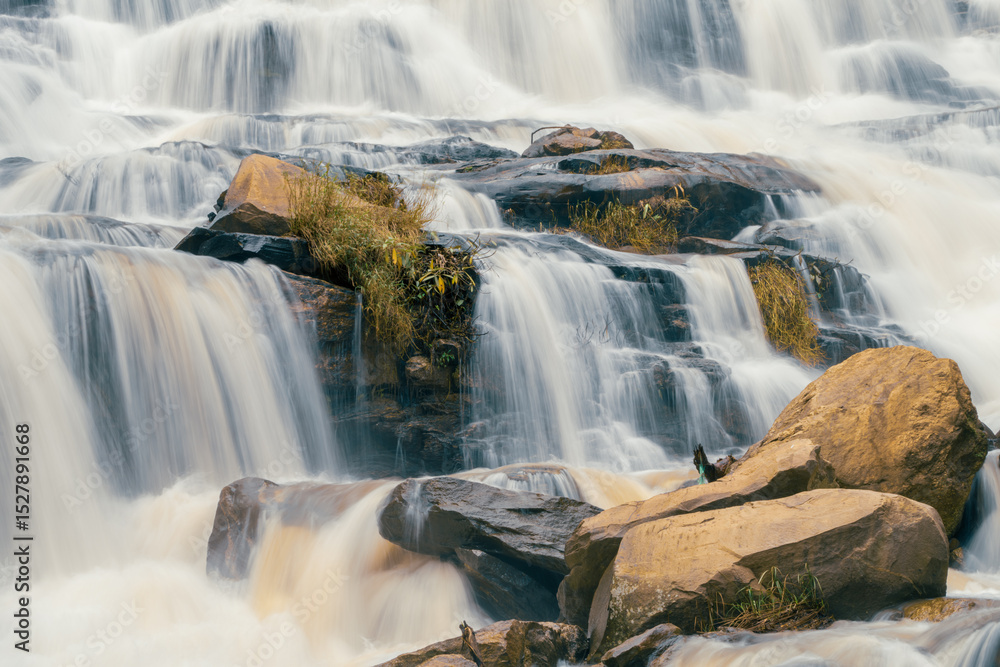 Beautiful waterfall with a lush green forest in the background. The water is flowing down the rocks and creating a beautiful scene. Sustainable waterfall in lush forest promoting water sustainability.