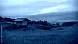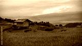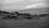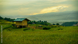 Scenic rural landscape at sunrise with a wooden house above lush green rice terraces and misty mountains, capturing peaceful farming lifestyle and sustainable agriculture in highland Asia