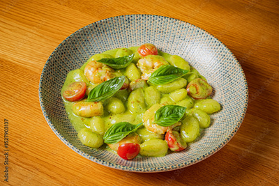 Delight in tender gnocchi paired with vibrant pesto, juicy cherry tomatoes, and fresh basil