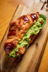 Croissant filled with salmon, mashed avocado, and spinach for a tasty delight
