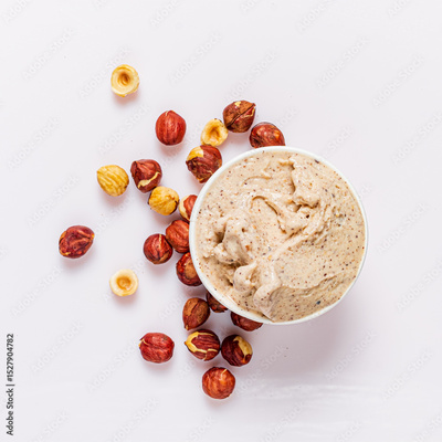 A nut spread in a white bowl is surrounded by crunchy nuts that add texture