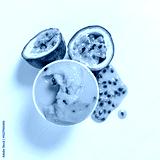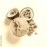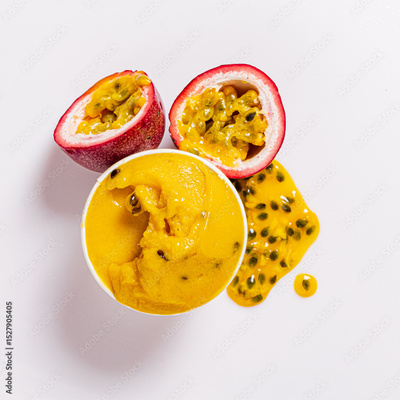 A delightful scoop of mango sorbet surrounded by juicy passionfruit halves and vibrant pulp