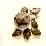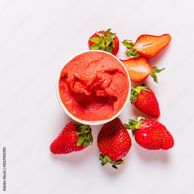 Bright red sorbet sits in a cup, encircled by vibrant, fresh strawberries ready for enjoyment
