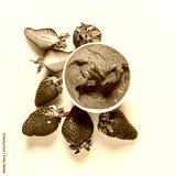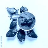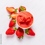 Bright strawberry sorbet in a bowl, surrounded by vibrant fresh strawberries, ready to enjoy