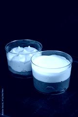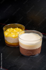 Two delightful dessert cups feature creamy chocolate and vibrant mango layers, enticing the palate