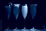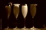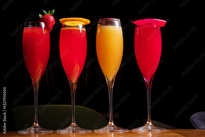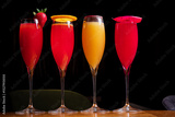 Four tall, elegant glasses hold vividly colored cocktails showcasing fresh fruits on top