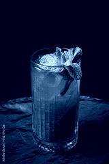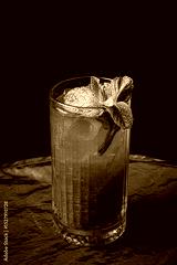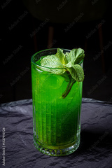 A vibrant green drink with mint leaves sits elegantly in a tall glass