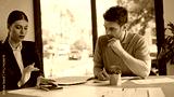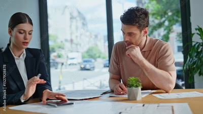Professionals discussing tax papers at office meeting closeup. Woman calculating