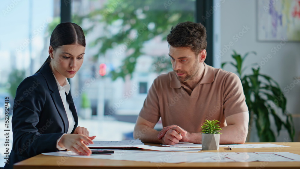 Business consultant calculating project to businessman at office meeting closeup
