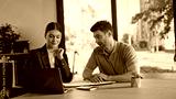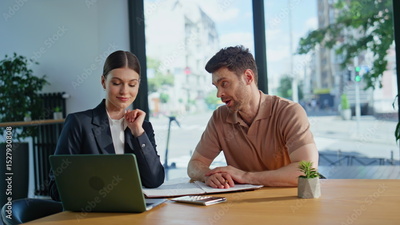 Woman explaining insurance contract to smiling man client showing laptop closeup