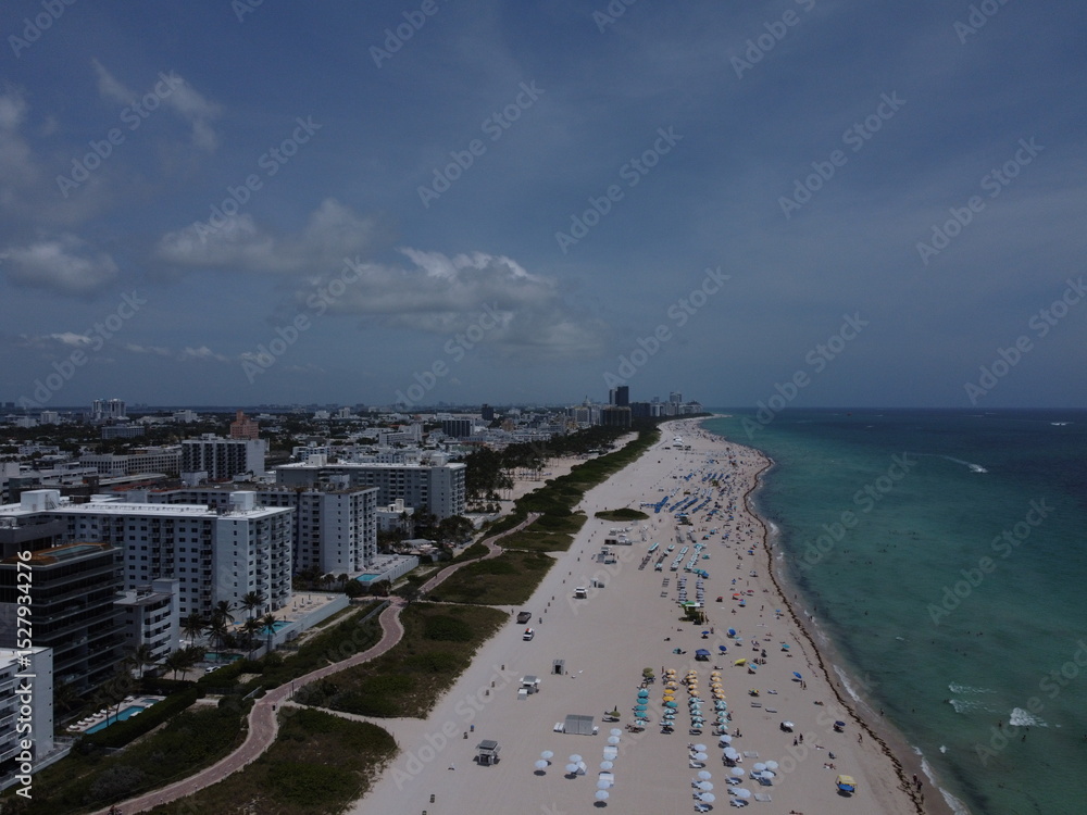 A stunning drone view of Miami Beach South Pointe showcasing the beach, park, and iconic skyline buildings.
