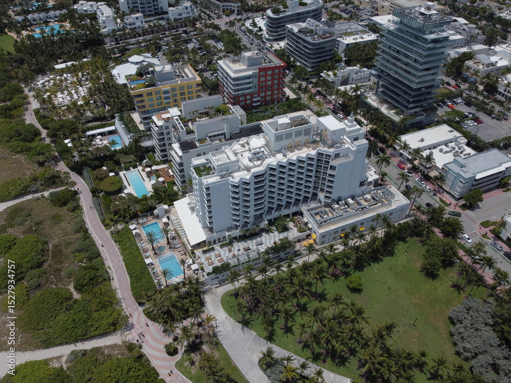 A stunning drone view of Miami Beach South Pointe showcasing the beach, park, and iconic skyline buildings.
