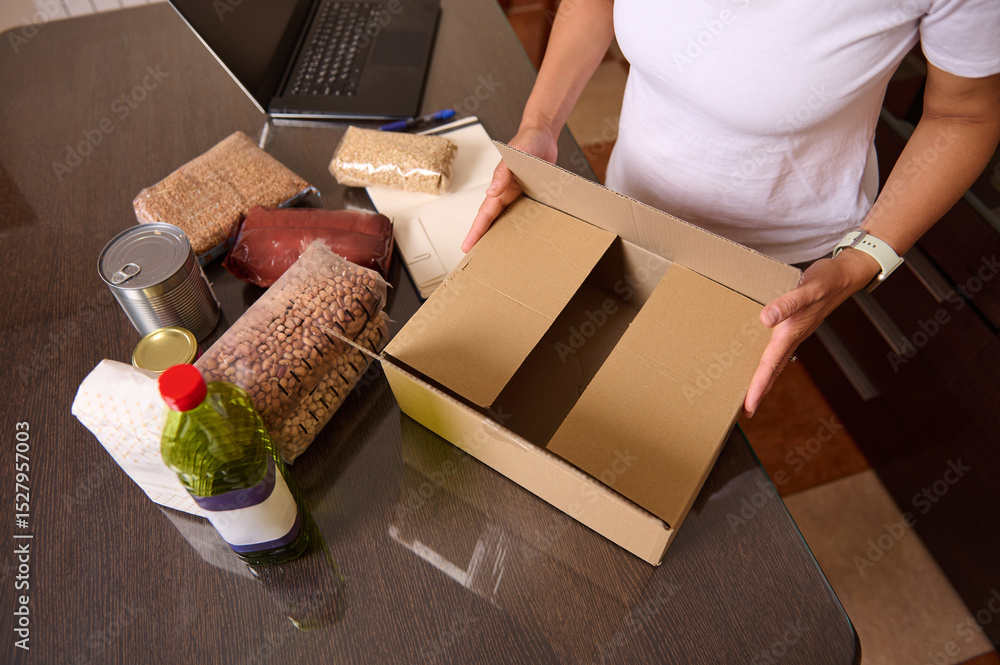 Person Packing Essential Food Items into a Cardboard Box on a Table with Supplies