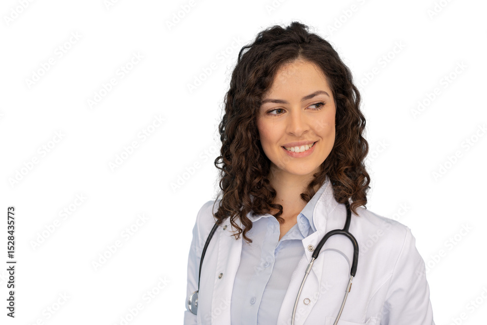 Professional female physician in white medical attire, stethoscope draped, radiating confidence against clean isolated backdrop
