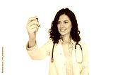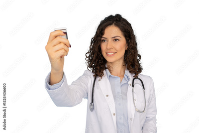 Female doctor wearing lab coat and stethoscope holding a pill container, isolated on transparent background