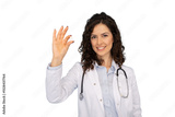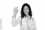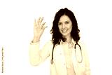 Smiling female doctor with curly hair holding a white pill, wearing a stethoscope. Transparent background enhances medical theme